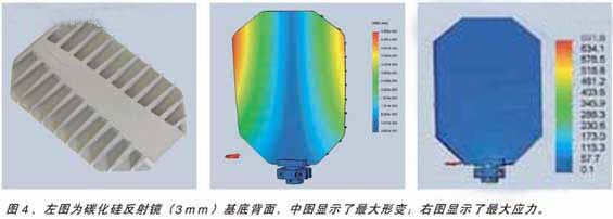 石英的一大缺點是它的熱導率很低,這導致它的冷卻性能很差。硅基材料,比如硅或碳化硅,可提供較高的熱導率。由于碳硅基材料強度更高,因此允許減小其厚度,盡管其密度較高,仍可減輕總體質(zhì)量。如果使用不透明基底,如Si或SiC,寬波段反射鍍鋁層可直接鍍在鍍電介質(zhì)膜和硅基材料之間介電層上。對反射鏡基底機械設計進行仔細的模型計算,可在穩(wěn)定性、重量、導熱性和轉(zhuǎn)動慣量方面獲得最優(yōu)化的設計。
