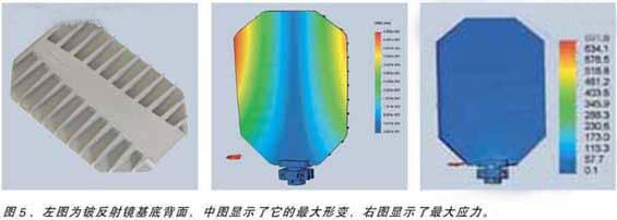 另外,基于模型計算優(yōu)化后的參數(shù)可確保最優(yōu)設計。由于較低密度和相對重量較高的楊氏模量值,鈹模型相對碳化硅模型的設計更為簡便。該材料的另一優(yōu)點是其吸附能力。對比碳化硅和鈹反射鏡,鈹模型比碳化硅少兩個臨界頻率。這將為伺服電路板和振鏡電機提供更為簡便的自動控制能力。結(jié)果是鈹反射鏡相對碳化硅反射鏡,重量減少35%,慣量減少35%。反射鏡設計,最大形變和最大應力如圖5所示。