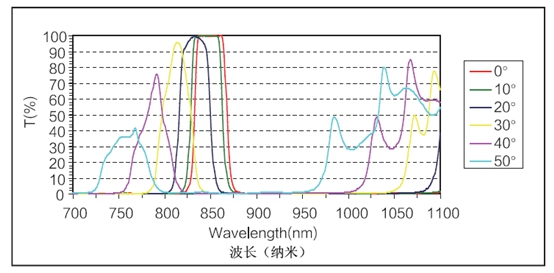 假如入射光線與濾光片的法線夾角有一定的規(guī)模,那么要指明這個夾角的詳細(xì)規(guī)模,由于干與濾光片的規(guī)劃對視點十分靈敏,關(guān)于0°下規(guī)劃的窄帶濾光片,假如在不一樣視點下運用,其作用是完全不一樣的。圖2是以850nm窄帶濾光片為例,當(dāng)入射視點增大時,基地波長的方位不斷向短波移動。