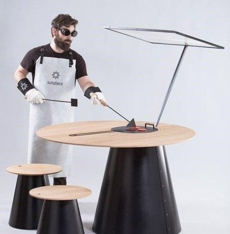 設(shè)計師二人組Lanzavecchia + Wai將透鏡與室外家具相結(jié)合,利用透鏡將太陽光聚集到一個燒烤板上來烹飪食物。來自意大利的設(shè)計師Francesca Lanzavecchia和來自新加坡的設(shè)計師Hunn Wai所設(shè)計的燒烤板介于燒烤架和日式鐵板燒之間。在天氣晴朗的時候,固定在桌子上方的玻璃透鏡會將自然光聚集到嵌在桌面里的鑄鐵燒烤板上。