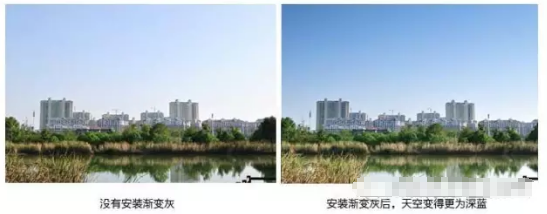 GDN鏡,是這樣的一塊透明的樹脂玻璃,上面從頂部至中間的部分染了灰色,而這個(gè)灰色就猶如Photoshop當(dāng)中的過(guò)渡工具拉出來(lái)的效果一樣,是從上到下(灰色)逐漸變淡的。而灰色對(duì)于光線有均勻吸收的特點(diǎn)。因此當(dāng)我們把這片鏡片放到鏡頭前面時(shí),便會(huì)發(fā)現(xiàn),天空的亮度被減弱了。