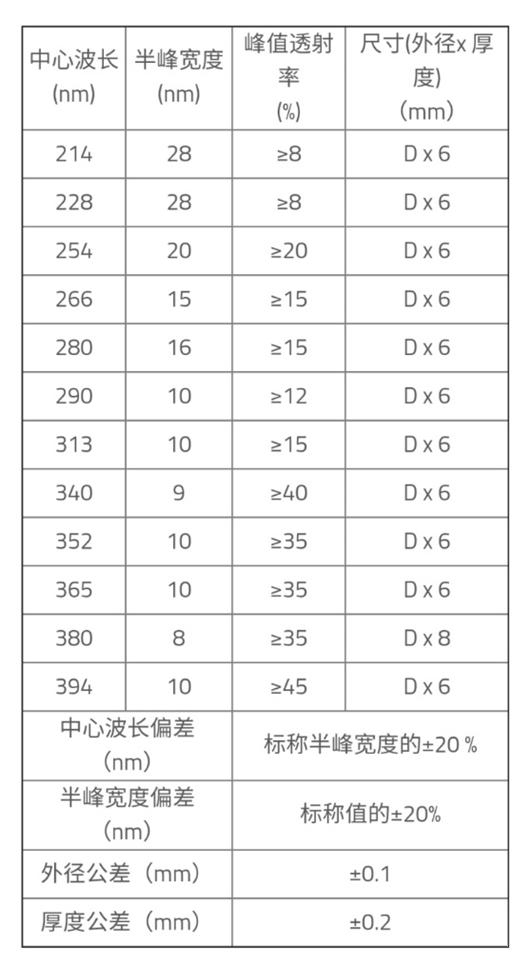 分為高性能窄帶、寬帶紫外帶通濾光片,光譜覆蓋范圍200nm~380nm。紫外帶通濾光片采用的是離子束輔助沉積工藝(IAD)和等離子輔助沉積工藝(PIAD)進行制造,濾光片膜層為高密度硬膜,這就保證了長久的使用壽命,為我們?nèi)蘸蟮姆€(wěn)定使用提供了保障。優(yōu)質(zhì)性能的紫外區(qū)帶通濾光片具備超高的截止背景深,可大幅提高系統(tǒng)信噪比。以下是為您列出的相關(guān)參數(shù)可供您參考選擇。