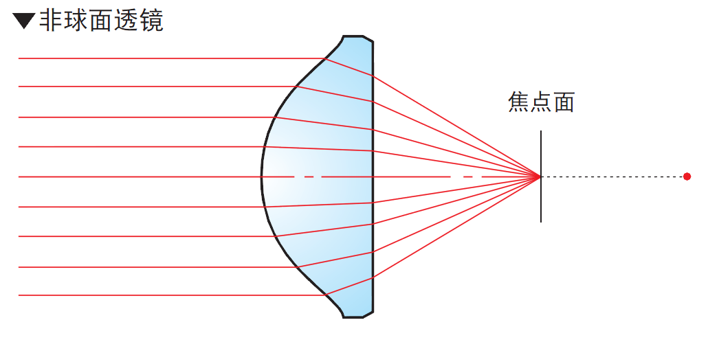 非球面透鏡是一種折射面為非球面的曲面的透鏡,這種透鏡具有更佳的曲率半徑,可以維持良好的像差修正,以獲得所需要的性能,一般可分成簡單曲面(如拋物面)和復(fù)合曲面兩類。經(jīng)過復(fù)雜計算的非球面透鏡,可用于透鏡組球面像差的校正。由于非球面表面經(jīng)適當(dāng)?shù)膹?fù)合,可使透鏡中央為正,邊緣為負,因而可以同時具有多種校正功能,并在理論上可使球面像差減少至0。