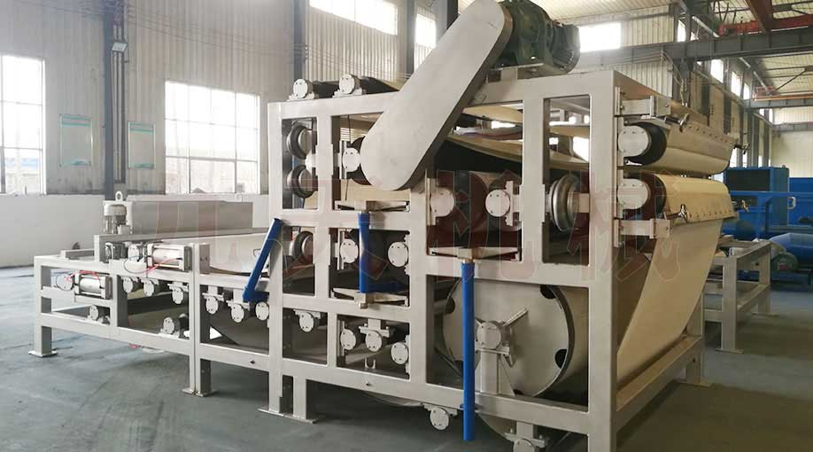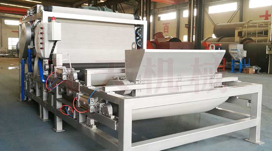 由給料斗將物料平鋪在濾帶上,經(jīng)重力脫水區(qū)、夾壓區(qū)、S型擠壓區(qū),重重反復(fù)擠壓,將清水擠出,流于下方水槽中排出,糟渣逐漸被擠壓脫水,然后由刮刀卸料器卸下。其中主機部分主要由1、機架 2、給料斗 3、濾網(wǎng) 4、張緊裝置 5、調(diào)偏裝置 6、驅(qū)動機構(gòu) 7、刮刀卸料裝置 8、各種軸承座及輥筒 9、污水槽 10、洗網(wǎng)裝置等組成。